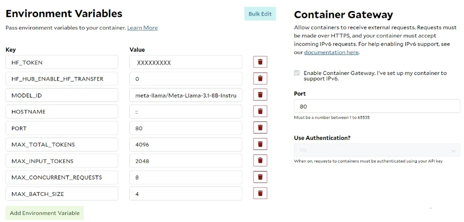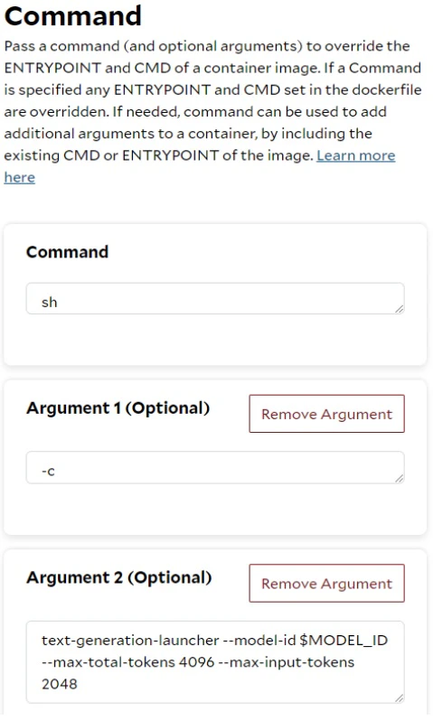 Sometimes, we can configure the TGI server to start with additional parameters using specific values without needing to pass many environment variables. SaladCloud offers the option to override the ENTRYPOINT and CMD in the image, which easily accommodates this requirement.