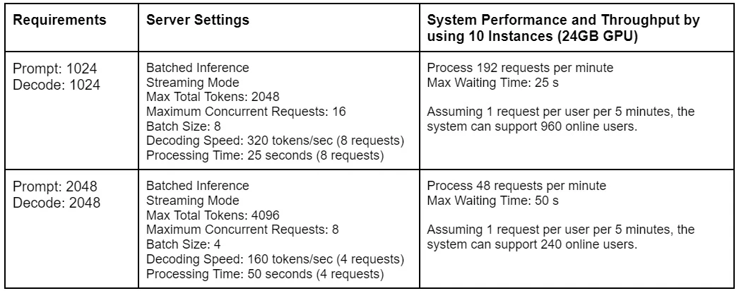| Batch Size 1 | 459.07 ms | 21.15 ms | 43288 ms | 47.29 tokens/sec | 43746 ms |