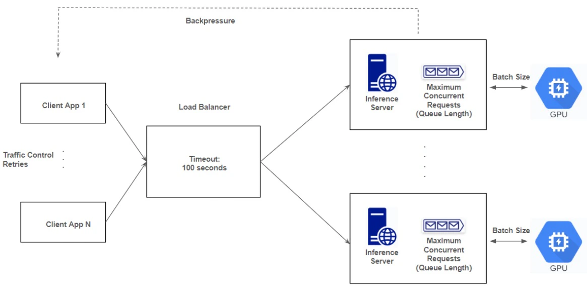 A container group integrated with a job queue offers a more resilient and cost-effective solution for batch processing systems where immediate responses are not required. You can submit millions of jobs to a job queue, which could be Salad JQ or AWS SQS. Instances with an I/O worker and the inference server, will then pull and process the jobs, subsequently uploading the generated texts to predefined locations, such as cloud storage or a webhook. The job queue features a large buffer for queuing requests and includes built-in retry logic. If an instance does not complete a job within a specified time, the job becomes available to other instances for processing. Each instance pulls new jobs only after finishing the existing ones, eliminating the need for mechanisms like backpressure, retries, and traffic control in both the inference servers and client applications. To implement this solution, you need to build a wrapper image that adds an I/O worker to the inference server. This worker will be responsible for pulling jobs, calling the inference server, uploading the generated texts and finally returning job results or status to the job queue.Build Your Own Queue