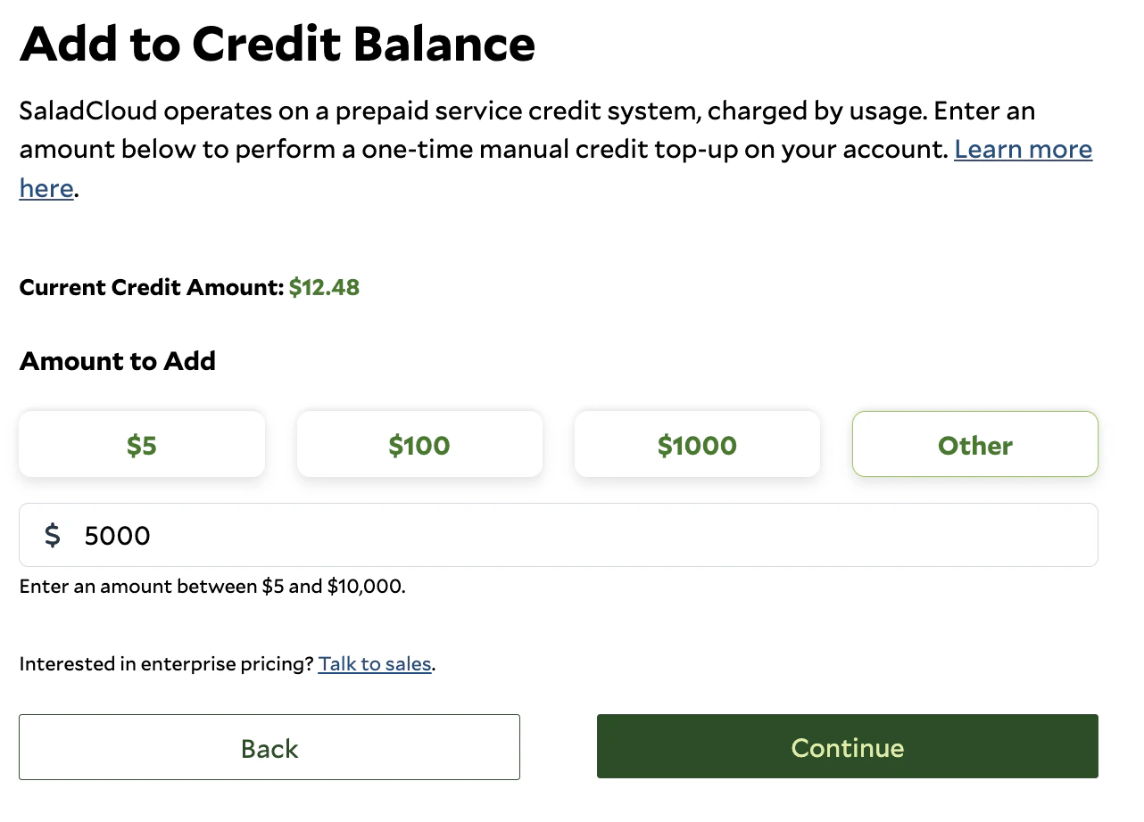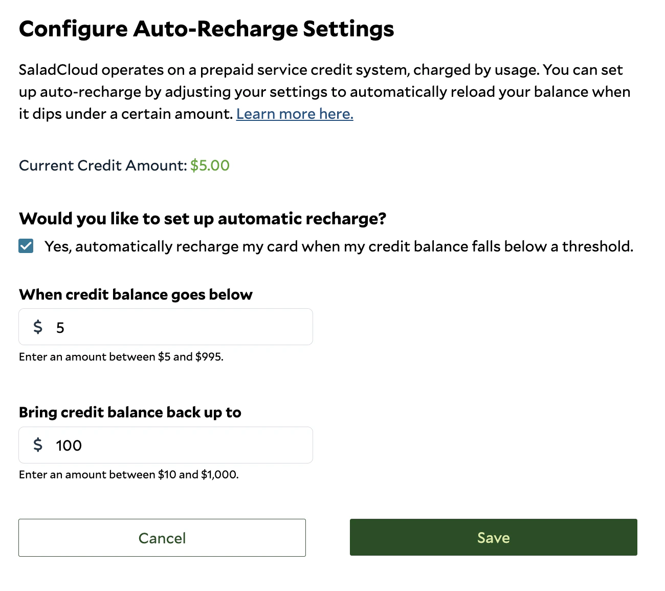 SaladCloud recommends enabling auto recharge for organizations serving production workloads to ensure uninterrupted service. With auto recharge, you configure a threshold and recharge amount, allowing SaladCloud to automatically replenish your organization’s credit balance when needed. • Recharge Threshold: The balance level that triggers an auto recharge (“when my balance falls below”). • Recharge Amount: The predefined amount SaladCloud charges to your payment method when the threshold is reached (“bring credit balance back up to”). You can update these settings anytime through the Billing & Usage page in your organization’s portal. If you set the recharge threshold to an amount higher than your current credit balance, an auto recharge will be triggered immediately upon saving the updated settings.