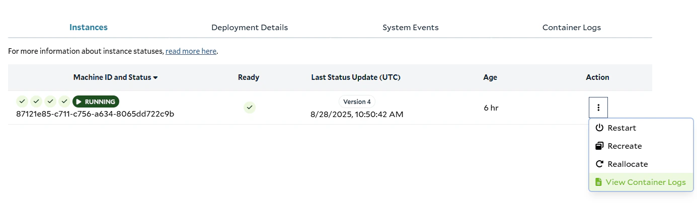 - filter for logs from a specific Machine ID. If left blank, logs from all Machine IDs in the Container Group will be returned.