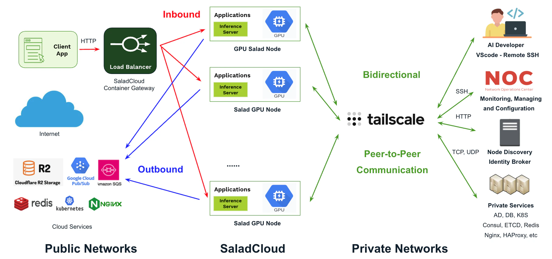 SaladCloud primarily handles GPU-intensive workloads across most use cases, while also interacting with external services or systems to receive requests or jobs and deliver results. Its native networking allows all nodes to initiate outbound connections to these systems. When the Container Gateway is enabled, the external systems can also send HTTP requests to a group of Salad nodes and receive responses seamlessly. Integrating Tailscale with SaladCloud unlocks additional use cases, including: