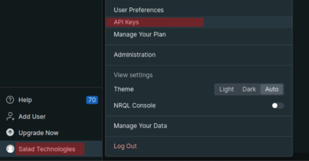 - Ingestion Key: This is long random string used to securely connect your SaladCloud containers to New Relic. You can find this key by clicking your name in the lower left hand corner of the screen (1). This opens a menu, where you will see an option for “API Keys”(2)