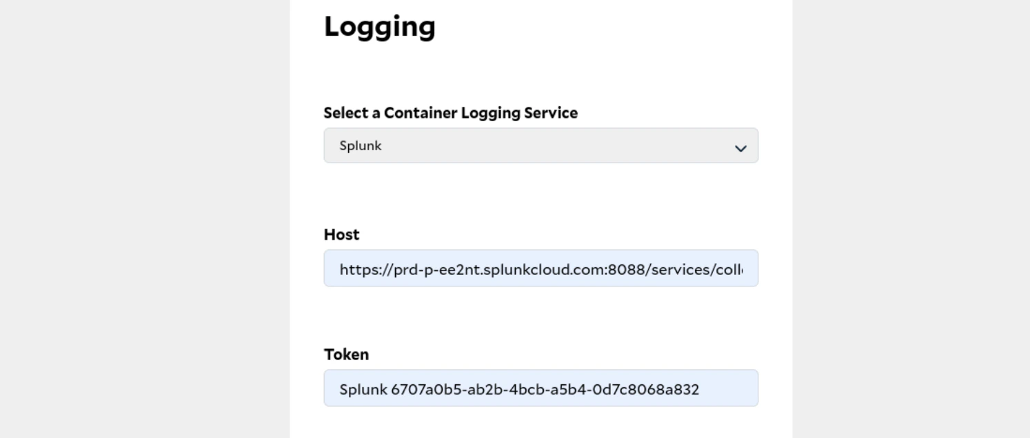- In the sidebar appears at right, click on “Splunk” under the option of “Select a Container Logging Service”.