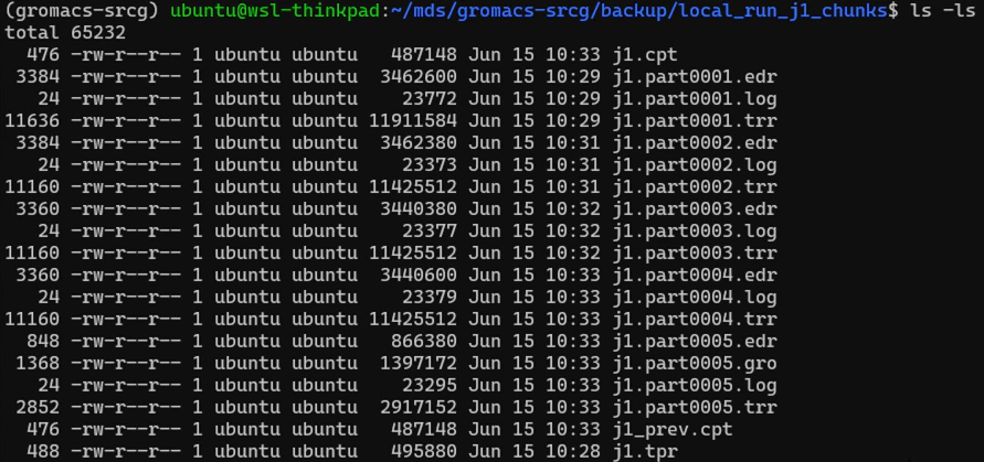 - .cpt – The checkpoint file, updated at configurable intervals (every 15 minutes by default) during the simulation. It allows the simulation to resume from the last saved state after an interruption. While its contents change, the file size remains constant for a given input. A _prev.cpt file may be created to store the previous checkpoint when a new checkpoint is written.