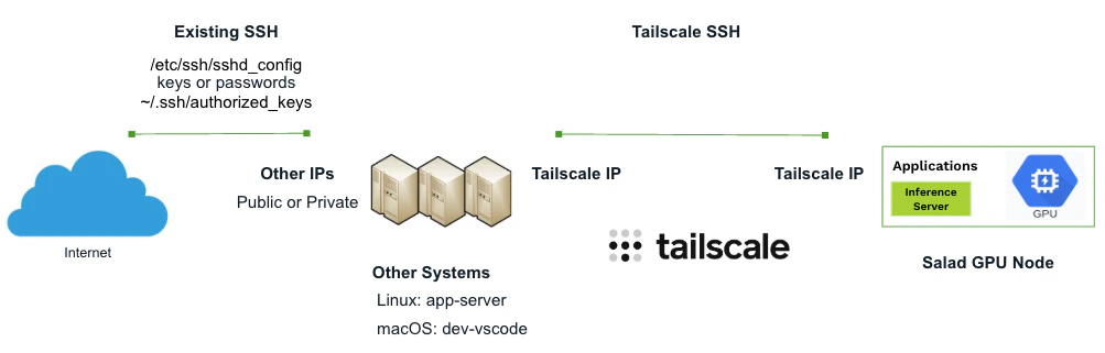 - Add the Salad node to the tailnet using a Tailscale auth key and its SALAD_MACHINE_ID, and start the Tailscale SSH server.