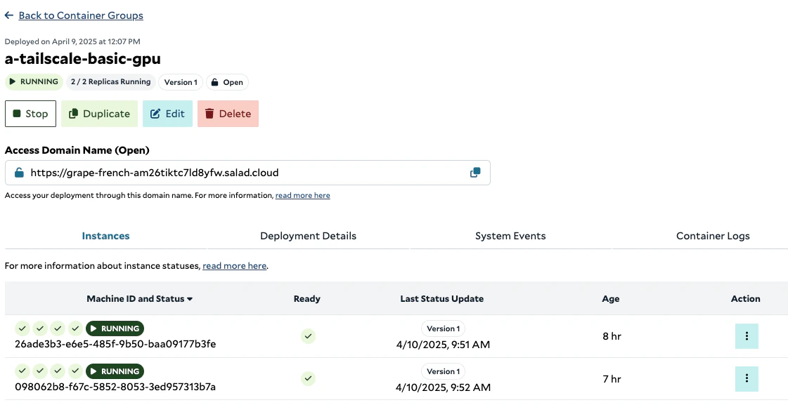 Let’s create a container group with the following parameters using the SaladCloud Portal. For deployment using SaladCloud APIs/SDKs, please refer to this link.Removing Inactive Devices Using Tailscale API