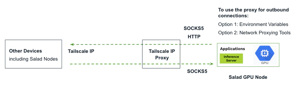 Tailscale must run in userspace networking mode on Salad nodes, which differs from the default mode. In this mode, Tailscale does not create a virtual network interface. Instead, it provides a local SOCKS5 and HTTP proxy for network communication. Outbound connections to other devices in the tailnet, including other Salad nodes, must be explicitly configured to route through the SOCKS5 or HTTP proxy. In contrast, inbound connections are automatically directed through the SOCKS5 proxy by Tailscale without requiring additional configuration.