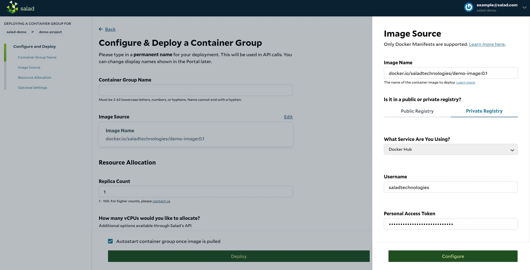 Access the SaladCloud portal, Set up your SCE by selecting the private registry tab when setting the image source. In the service dropdown option, choose “Docker Hub” and provide the following information: