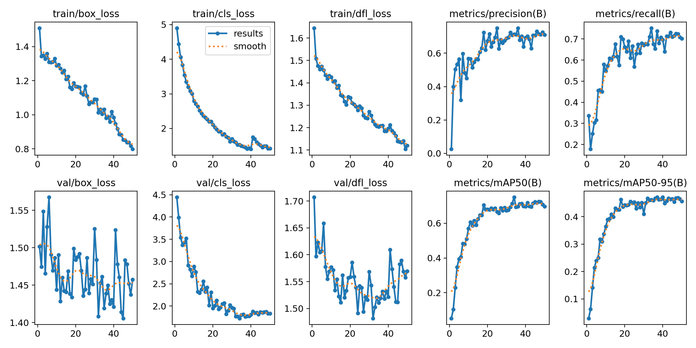 Duration of Training: Training session for the YOLOv8 Small model was completed in about 15 minutes. Trainings Results: