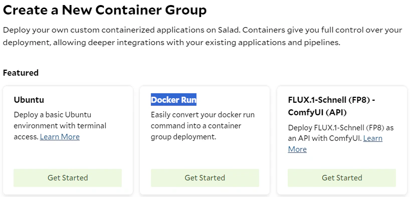 While most of a docker run command and its parameters can be directly translated into the container group deployment on SaladCloud to run a GPU-accelerated application, some aspects may need to be adjusted and replaced to fully optimize the use of SaladCloud.- SaladCloud is the powerful, highly scalable and cost-effective platform for requirements that involve tens to thousands of GPUs for large-scale and on-demand AI inference (such as image generation or LLM), utilizing a load balancer, or a batch-processing system to handle millions of jobs (transcription, molecular simulation) within a specified timeframe. However, single-instance, UI-based, or database applications are not well-suited for SaladCloud.