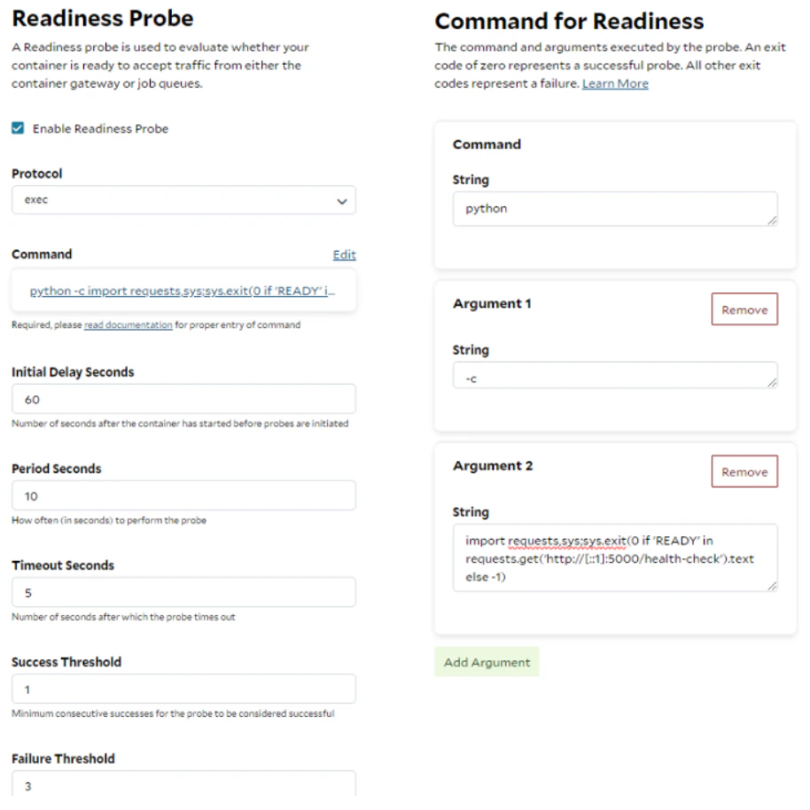 Health probes offer an automated mechanism to initiate specific actions based on the status of containers within a container group. You can think of a probe as a piece of code running alongside the inference server within the same container, allowing it to access the service locally or the shared file system. Readiness probes are essential when deploying a container gateway, as they ensure that requests are only forwarded to an instance when it is fully prepared—for example, when the model has been loaded and warmed up. When configuring a readiness probe on SaladCloud, you can utilize TCP, gRPC, and HTTP protocols. SaladCloud does not provide an option to explicitly select IPv4 or IPv6; it defaults to using IPv6 when the container gateway is deployed, and reverts to IPv4 otherwise. Here is an example: This HTTP probe checks the health of the inference server running inside the instance. The probe sends an HTTP GET request on port 5000 at the root path ( / ) and evaluates the response code. If a status code of 200 is returned, the probe is considered successful, and the container gateway will begin forwarding traffic to the instance. After 3 consecutive failures, the probe is marked as failed, and while the instance will remain running on the node, it will stop receiving requests from the gateway. It’s important to note that readiness probes may fluctuate between passing and failing.