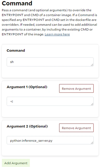The —entrypoint ‘sh’ and -c ‘python inference_server.py’ options in the command are converted to the Command deployment within the container group. This feature allows you to provide or override the original ENTRYPOINT and CMD instructions specified in the Dockerfile. With this flexibility, you don’t need to modify the Dockerfile, rebuild and push the image every time you change settings and code or run different applications.