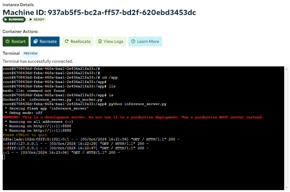 Let’s perform another test. In this scenario, you are building a real-time, on-demand inference application using a group of GPU-powered container instances, accessible through a container gateway (load balancer). Your client application, such as AI Agent or Web UI, interacts with users directly, and forwards the inference requests to the instances through the container gateway. This setup is not intended for long-running tasks. The container gateway has a timeout setting, and requests must be processed and returned by instances within 100 seconds.Docker Run