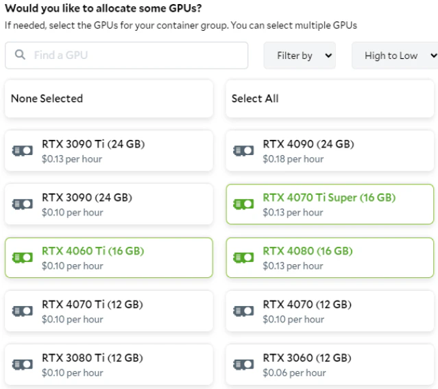 The —gpus all option in the command allocates all available GPUs on the host to the container, enabling GPU support for applications running inside it. SaladCloud currently supports only one GPU per container. When creating a container group, you can select multiple GPU types at a priority level (Batch/Low/Medium/High), along with the required vCPU, memory and disk space. SaladCloud will then allocate the appropriate SaladCloud nodes that match these selections to run the container group.