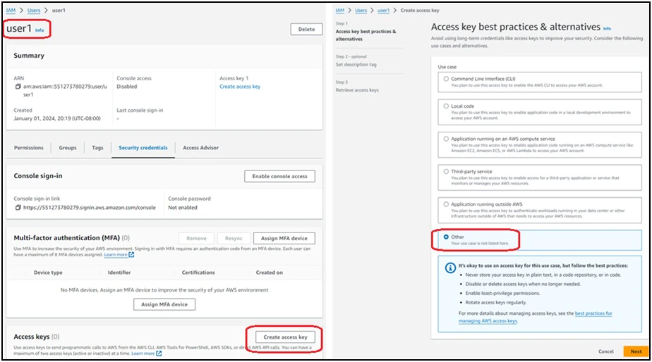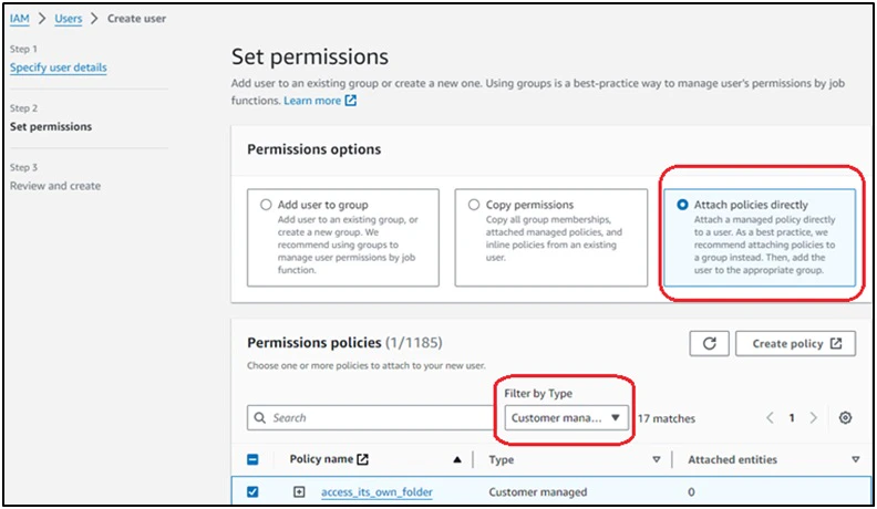 Create an AWS IAM user (‘user1’) without the AWS Console access and attach the customer-managed AWS IAM policy (‘access_its_own_folder’) to the user.