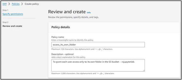 Create an AWS IAM policy (‘access_its_own_folder’) using the provided JSON file. This policy will be attached to AWS IAM users, ensuring that each user can exclusively access their own folder in the same S3 bucket.