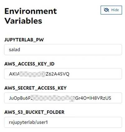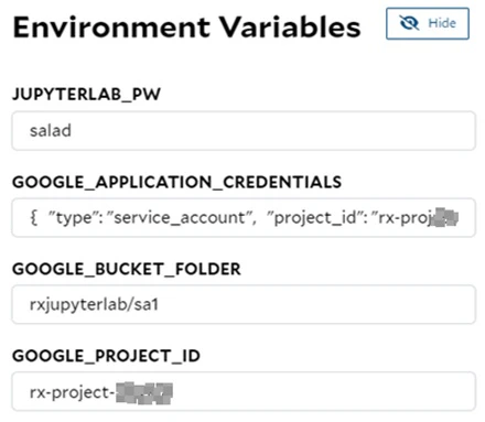 | Environment Variables | Provide the corresponding environment variables based on your needs. JupyterLab Password:JUPYTERLAB_PW; AWS:AWS_ACCESS_KEY_ID,AWS_SECRET_ACCESS_KEY,AWS_S3_BUCKET_FOLDER; Azure:AZURE_CONTAINER_URL,AZURE_BLOB_SAS_TOKEN; GCP:GOOGLE_APPLICATION_CREDENTIALS,GOOGLE_BUCKET_FOLDER,GOOGLE_PROJECT_ID |