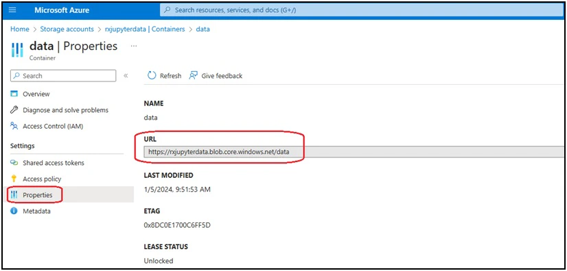 Log into the Azure Console, and create an Azure Storage Account (‘rxjupyterdata’) with the default settings in one of the Azure Regions, and create a container (‘data’) within the storage account. This container will be synchronized with the /root/data directory inside a JupyterLab container running on SaladCloud. If an organization is providing the JupyterLab service for numerous users and aims to ensure exclusive access to their own data, creating one container per user within the same storage account is a recommended approach in Azure.