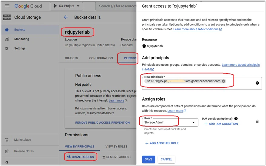 Navigate to the “rxjupyterlab” bucket again and grant the “Storage Admin” role to the sa1 service account. Unlike AWS, GCP does not provide an easy way to grant access only to a specific folder inside the bucket. With the above role assignment, the sa1 service account will have access to the entire bucket.