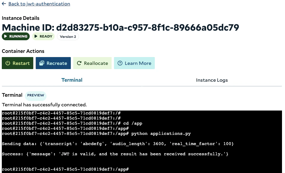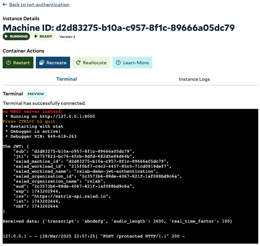 Typically, applications running on Salad nodes obtain the JWT and include it in the HTTP header when making requests to external services. These services validate the JWT against the JWKS endpoint to authorize access or exchange it for fine-grained access to other services. Below are two code snippets: one for applications running on SaladCloud and the other for external services that the applications call to return job results. These examples demonstrate how to use the JWT for authentication. For simplicity, both snippets are executed on a Salad node. Before running the code, ensure that the required Python dependencies are installed, including salad-cloud-imds-sdk, Flask, pyjwt, and cryptography.applications.py