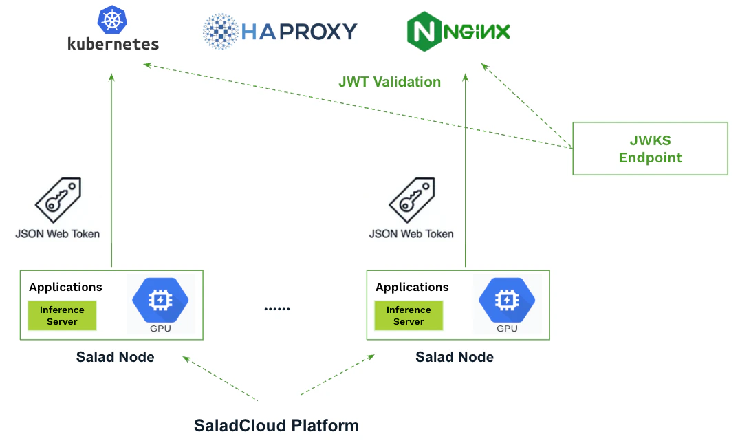 - The services (or proxies) validate the JWT using the JWKS endpoint, granting access and permissions based on the token’s claims, such as salad_container_group_id and salad_machine_id.