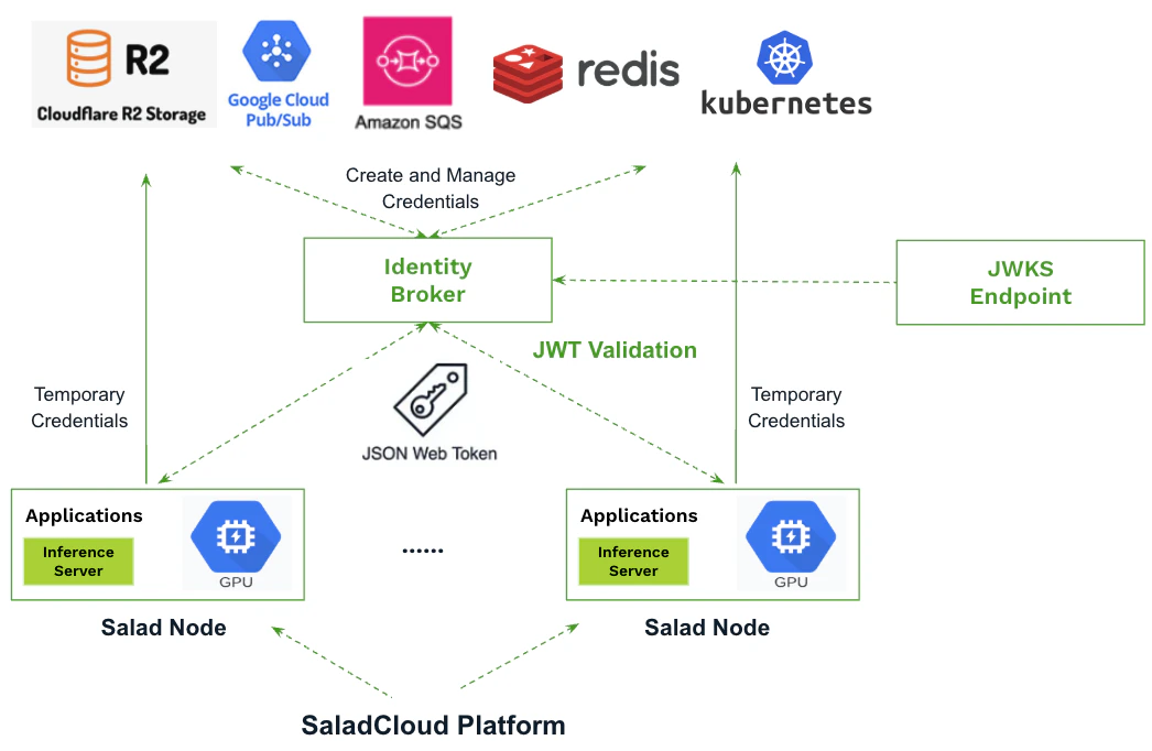 JSON Web Token (JWT) is a compact, secure mechanism for authentication and authorization in modern web applications and APIs. It supports stateless authentication, removing the requirement for servers to store session data—ideal for scalable, distributed systems. JWTs can be signed with a private key, and servers verify them using the corresponding public key, ensuring integrity and authenticity. A JSON Web Key (JWK) is a standardized format for representing cryptographic keys in JSON, typically for conveying public keys. A JSON Web Key Set (JWKS) is a collection of JWKs, often used to manage and share public keys for JWT validation. SaladCloud primarily runs GPU-intensive workloads for most use cases, while also requiring interaction with external services or systems to retrieve jobs and return results. Applications can now retrieve JWTs for each Salad node and use the provided JWKS endpoint for JWT-based authentication. This eliminates the need to pass credentials (via environment variables, private images, or other methods) for workloads on SaladCloud to access external services, including cloud providers (AWS, Azure, GCP), as well as custom services (such as Kubernetes and Redis clusters). The solution simplifies identity management, enhances security, and improves scalability. Here are some common scenarios for JWT authentication on SaladCloud:Accessing HTTP Services
